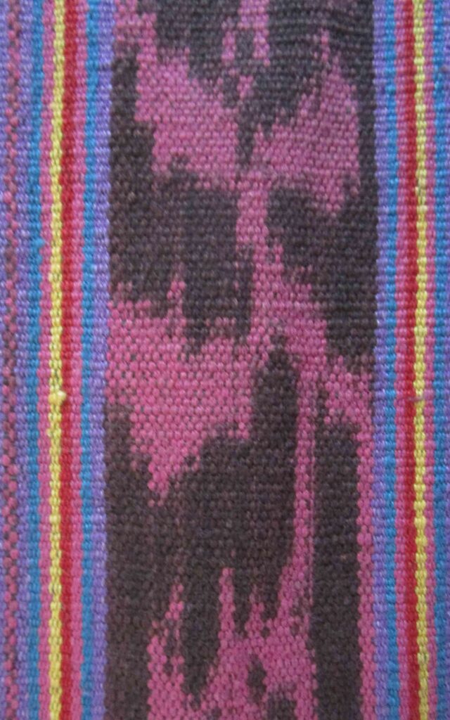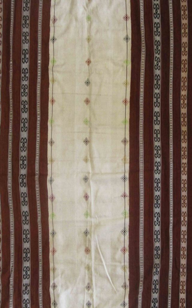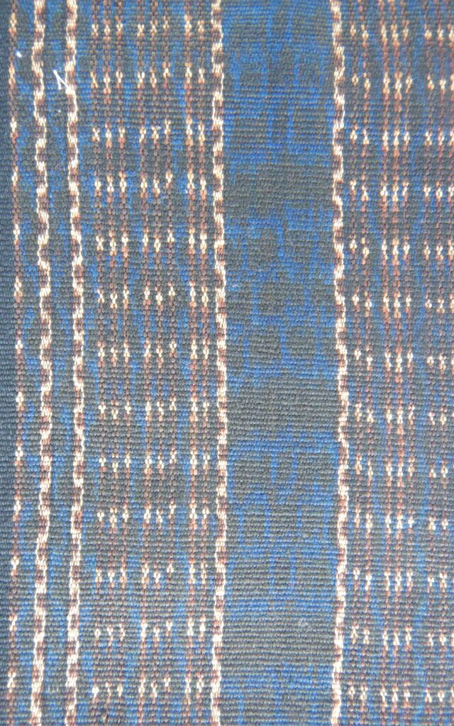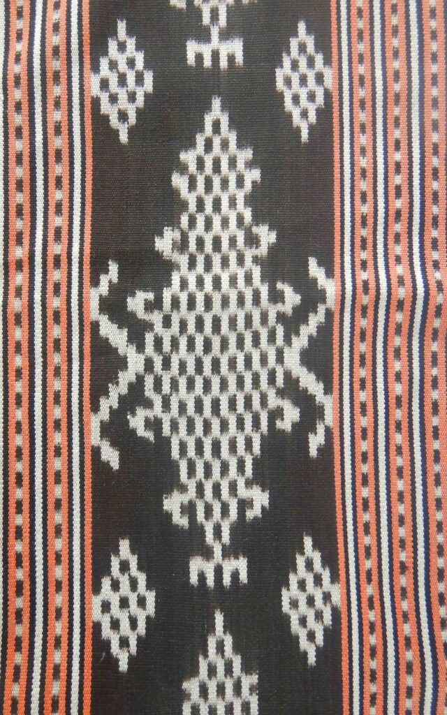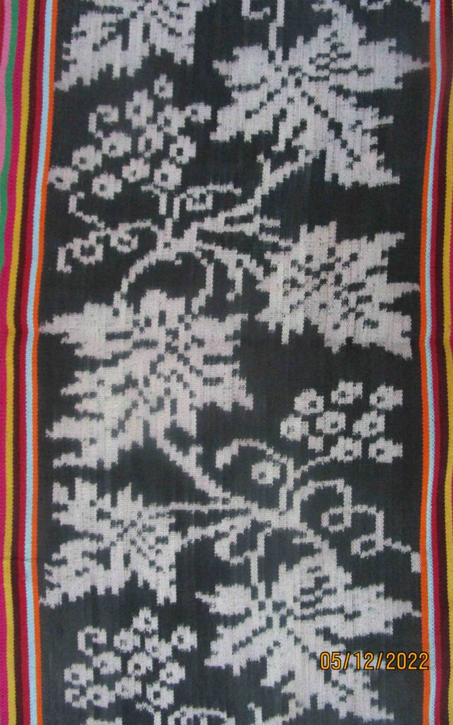 TA0266 Name of Tais: Rabi Kalau Me Ethnicity Midiki or Kairui District and Village Baucau, Waitobono/Fatulia/Venilale Technique Futus Size 141×86 cm Material Yarn: Commercial Cotton Dye: Natural and Synthetic Color Motif Ai-funan (Flower) Midiki or Kairui Baucau, Waitobono/Fatulia/Venilale Futus 141×86 cm Yarn: Commercial Cotton Dye: Natural and Synthetic Color Ai-funan (Flower)